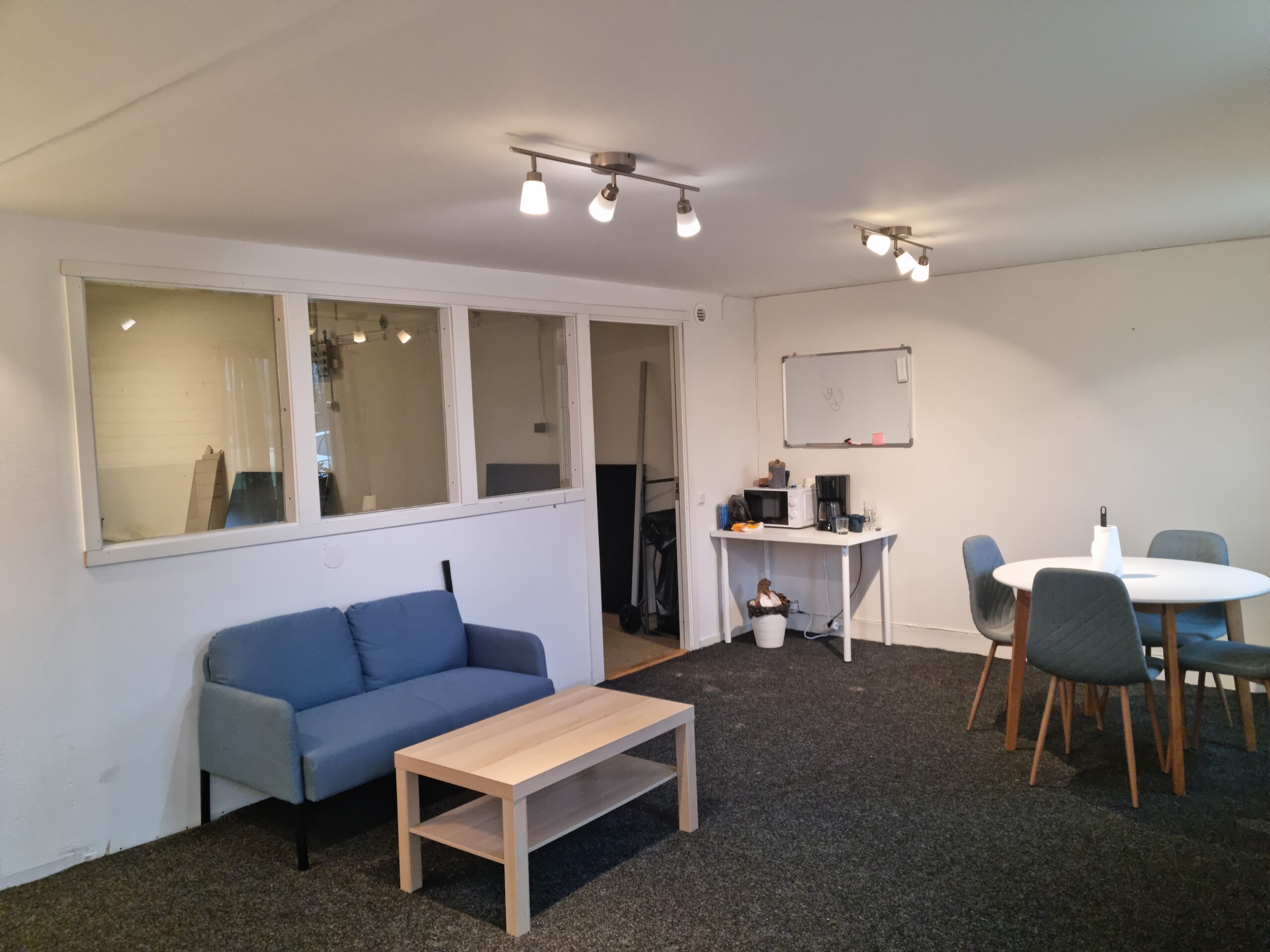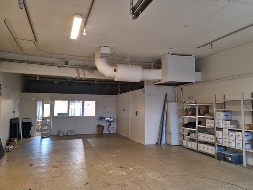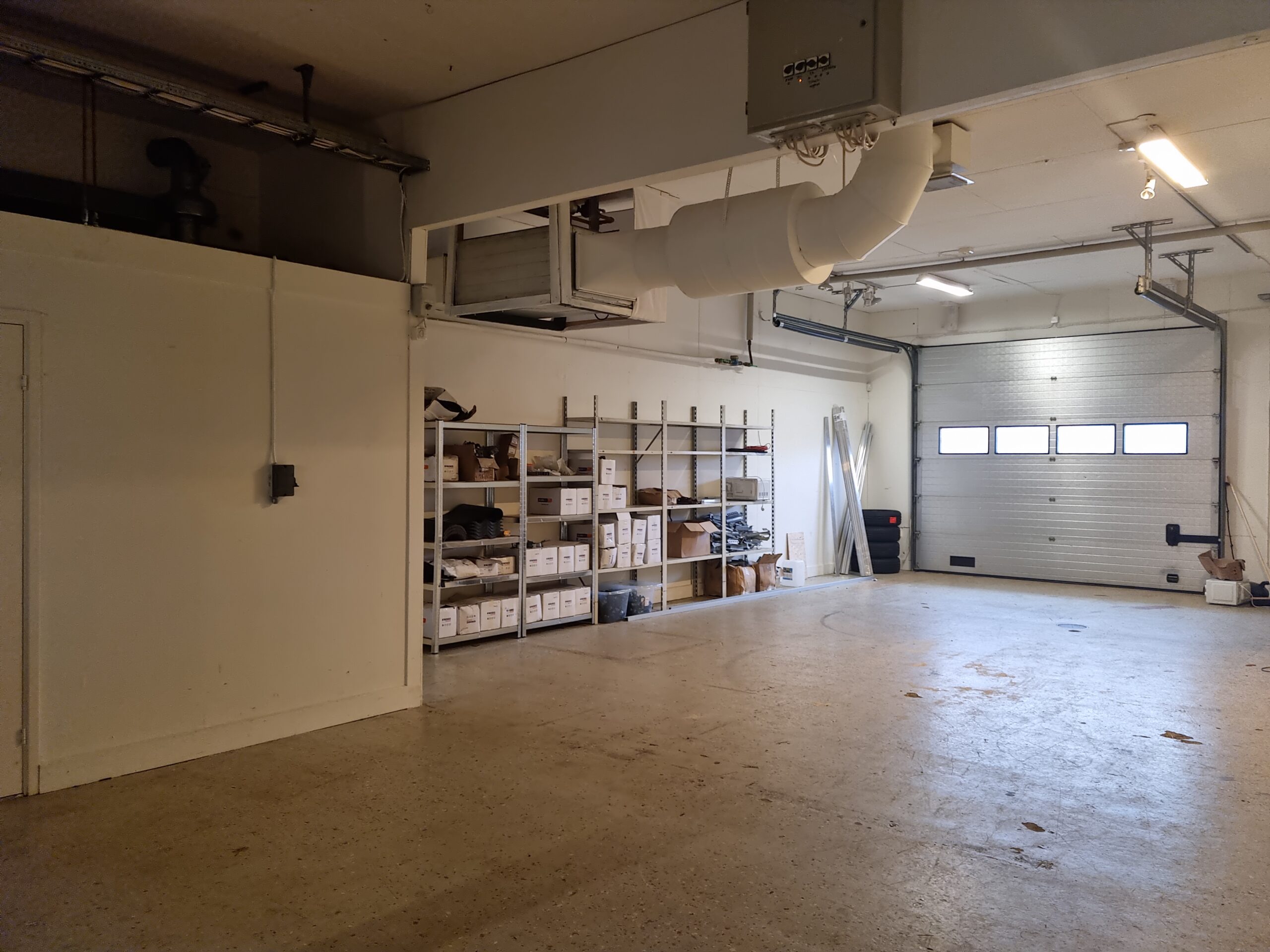 Lokalen har en större lagerdel ca 100 kvm med port och lageringång i markplan här finns också ett mindre utrymme med en toalett och dusch. I söder finns en entré från kundparkeringen som leder in i kontorsdelen som också kan användas som butik eller showroom.